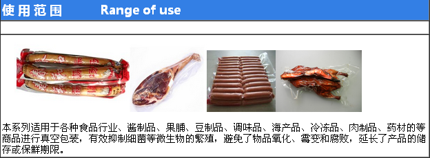 該機適 用如:肉類加工、醬腌產(chǎn)品、水產(chǎn)、海產(chǎn)品加工、蔬菜加工、農(nóng)副產(chǎn)品加工、果脯、糧食、豆制品、藥材、電器、化學(xué)制品等顆粒、粉狀、液體等食品進行真空后充惰性氣體包裝、可以防止產(chǎn)品氧化霉變、腐敗、防潮達到延長產(chǎn)品的儲存期限。